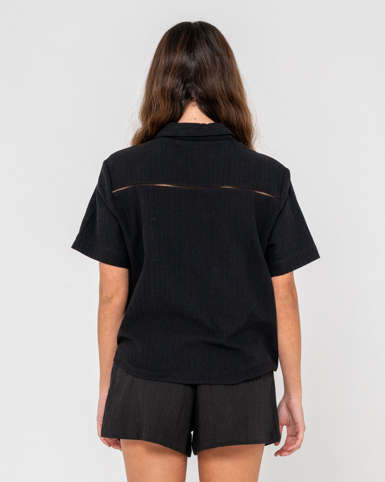 SHORT SLEEVE BOX FIT BUTTON UP SHIRT WITH LADDERING DETAIL